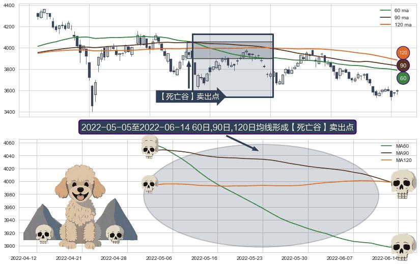 形态多维评估: ⚀ 2022-05-06-日至2022-06-14-日显现 60日-90日-120日均线 【死亡谷】卖出点 看空信号,后市看跌,卖出