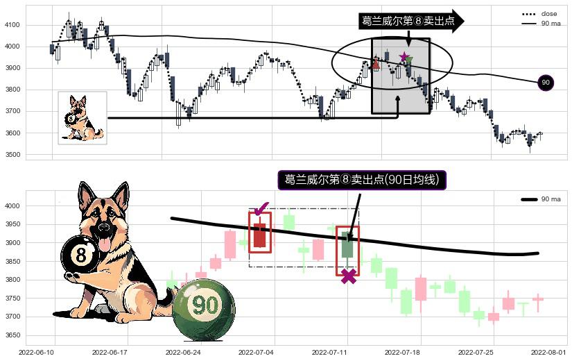 形态多维评估: ⚀ 2022-07-11-日显现 葛兰威尔均线 90日均线 第⑧卖出点 下降趋势的中继信号,后市看跌,卖出信号