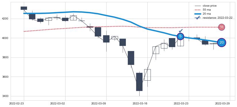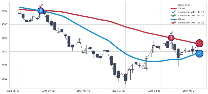 下跌趋势2021-06-17-2021-08-27,均线20, 55确认关键阻力2处
