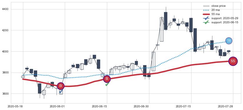 上涨趋势2020-05-18-2020-07-28,均线55确认关键支撑2处