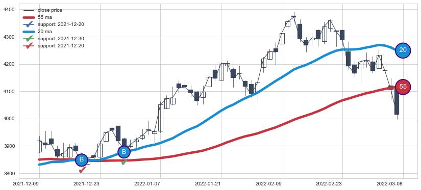 上涨趋势2021-12-09-2022-03-08,均线20, 55确认关键支撑2处