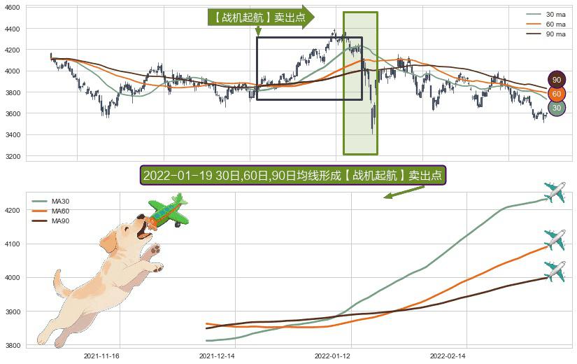 形态多维评估: ⚀ 2021-12-07日-2022-03-04日显现 30日-60日-90日均线 【战机起航】卖出点 看空信号,后市看跌,卖出
