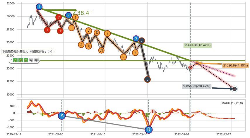 ♞ 延续前期下跌趋势提供的关键价格位有1个:21471.36,将对后续走势造成一定阻力
