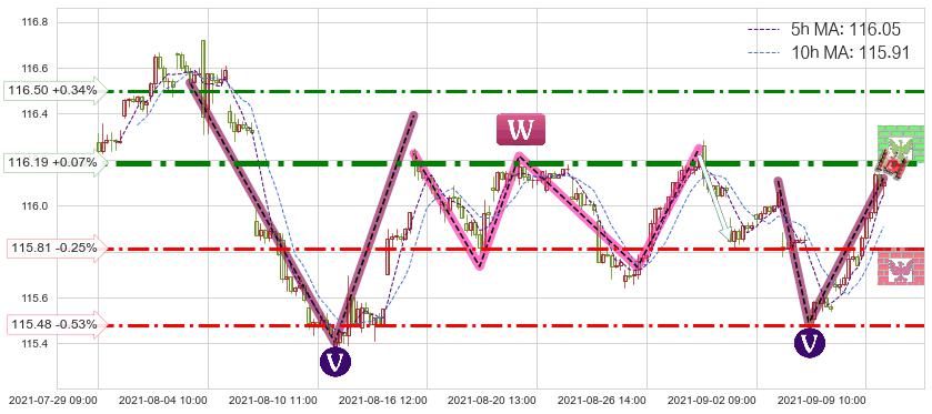 ♞ 5小时均线:116.05,10小时均线:115.91→ 快线>慢线