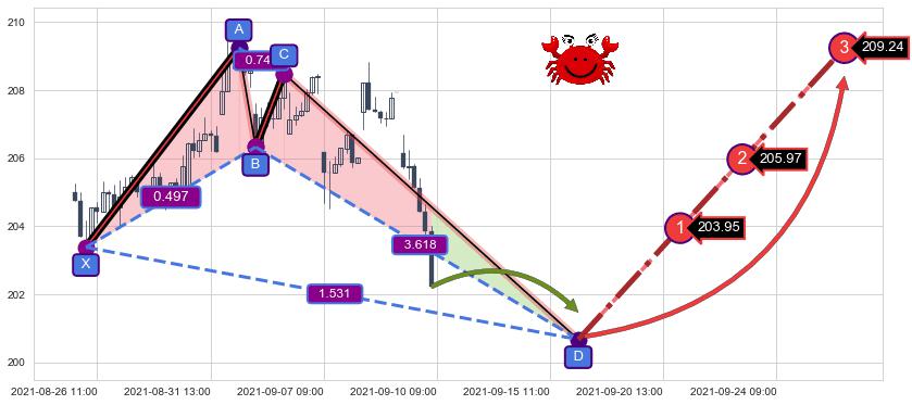 ➢ 距离预测D点位置尚有下跌空间,短线依然【看跌】, 耐心等待看涨【螃蟹】形态反转启动