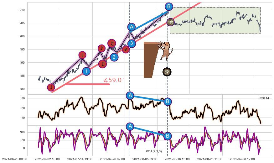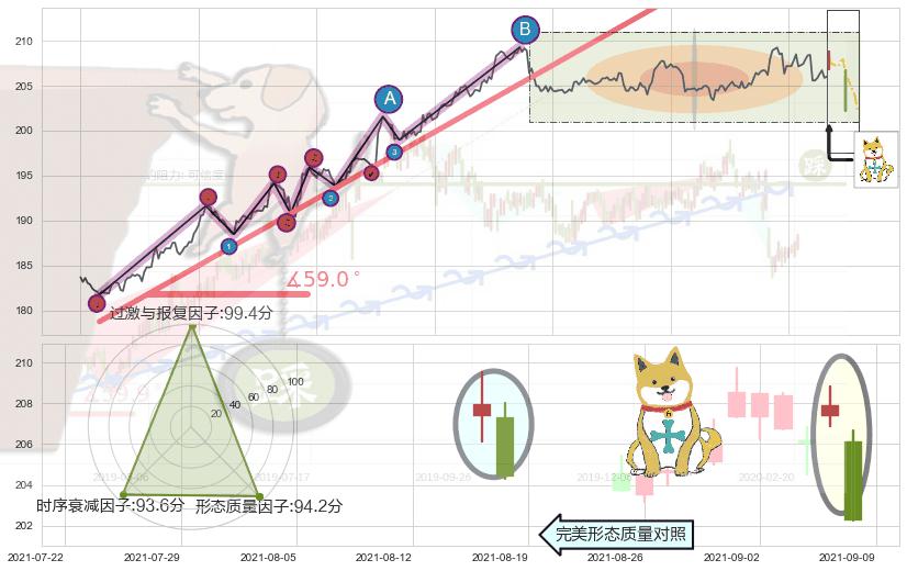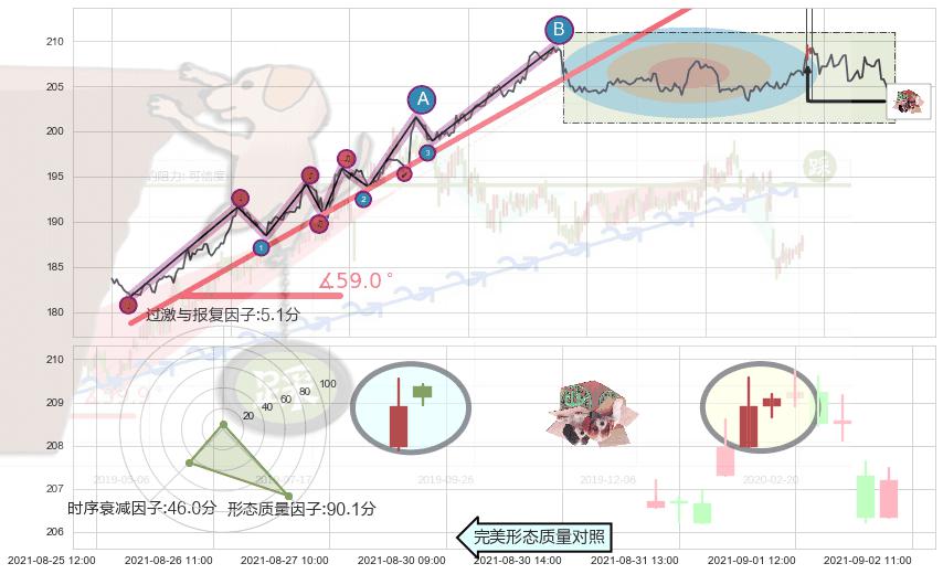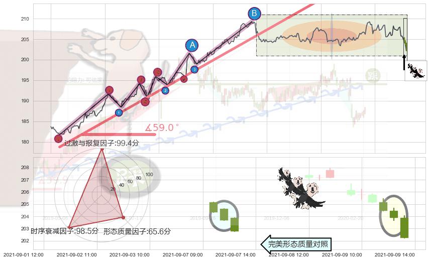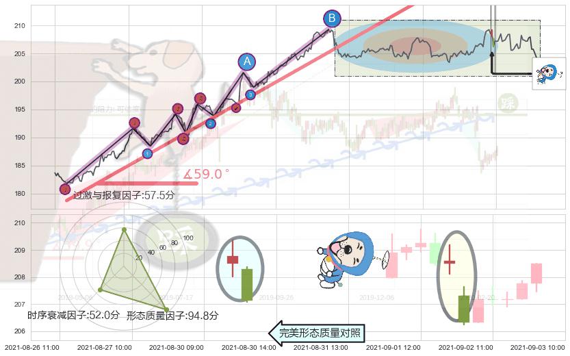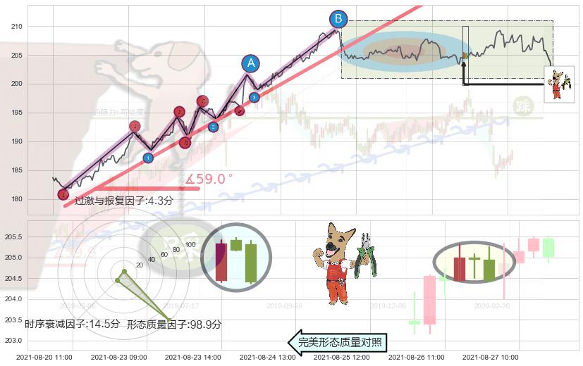 从2021-06-30 12:00至2021-08-25 14:00,共包含260个小时,阶段股价上涨11.54%,阶段股价变动位移路程比: 1 : 5,上涨趋势角度: 59.0