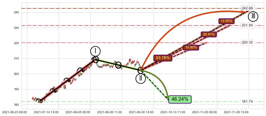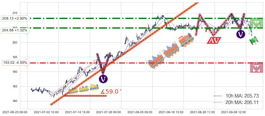 ➢ 【仅预测突破】最后价格:202.22与预测突破价格:208.28→【空间较大】后续最小【整理】第一目标价格→(10-13:09: 229.07 )