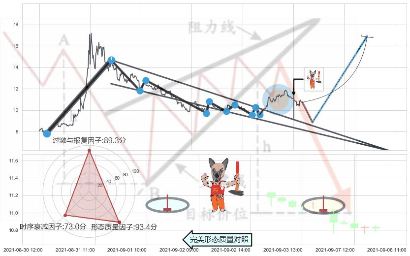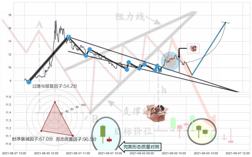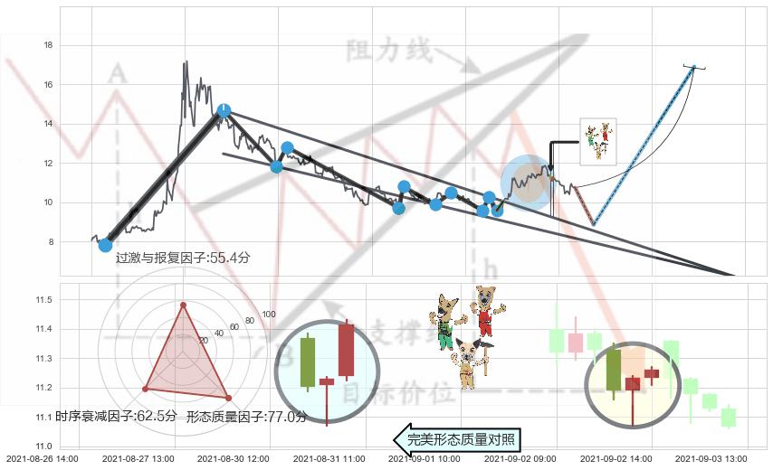 ➢ 🕰 价格走势在2021-09-03 10:00:00至2021-09-03 11:00:00期间形成底部尽头线(上山虎),残存影响值:4.59