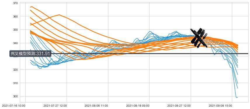 ➢ 21小时均线于(08-30 15:00: 344.37)形成【死叉】基于【死叉历史模型】预测死叉后最低波谷价格: 333.11, 死叉后最低价格297.55,已经下跌超出预测最低波谷价格, 预期反弹