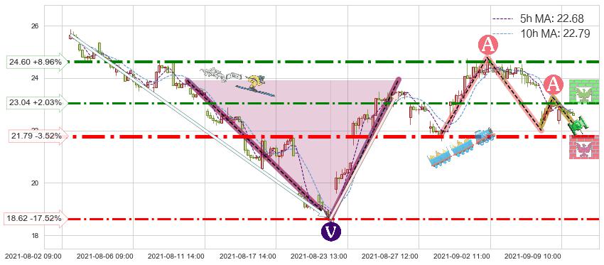 ♘ 阻力价格位23.04,可信任强度68.03%,距离最后交易2021-09-09 14:00形成的收盘价格22.58相差 +2.03%