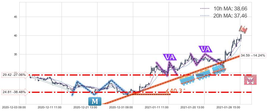 从2020-12-21 09:00至2021-01-28 16:00,共包含206个小时,阶段股价上涨49.66%,阶段股价变动位移路程比: 1 : 4,上涨趋势角度: 40.3