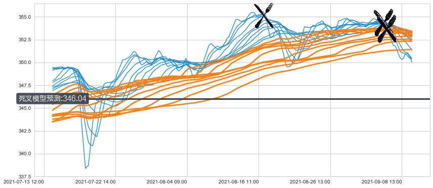 ➣ 70小时均线于(09-03 15:00: 353.76)形成【死叉】基于【死叉历史模型】预测死叉后最低波谷价格: 345.34, 死叉后最低价格349.31,尚未达到预测最低波谷价格, 预期继续下跌
