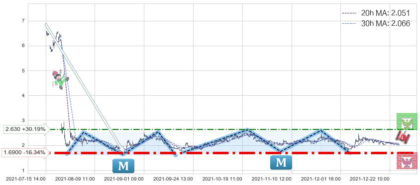 ♘ 阻力价格位2.630,可信任强度49.80%,距离最后交易2021-12-27 15:00形成的收盘价格2.020相差 +30.19%