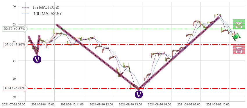 ♞ 5小时均线:52.50,10小时均线:52.57→ 快线<慢线