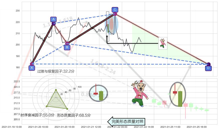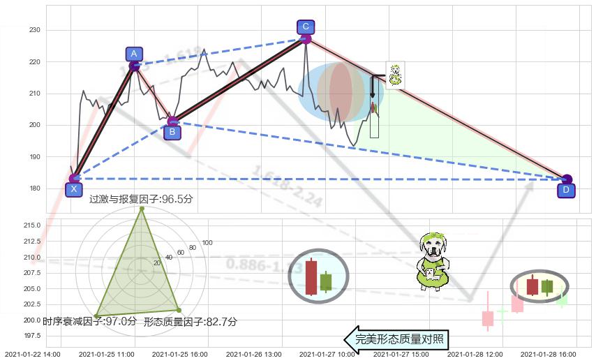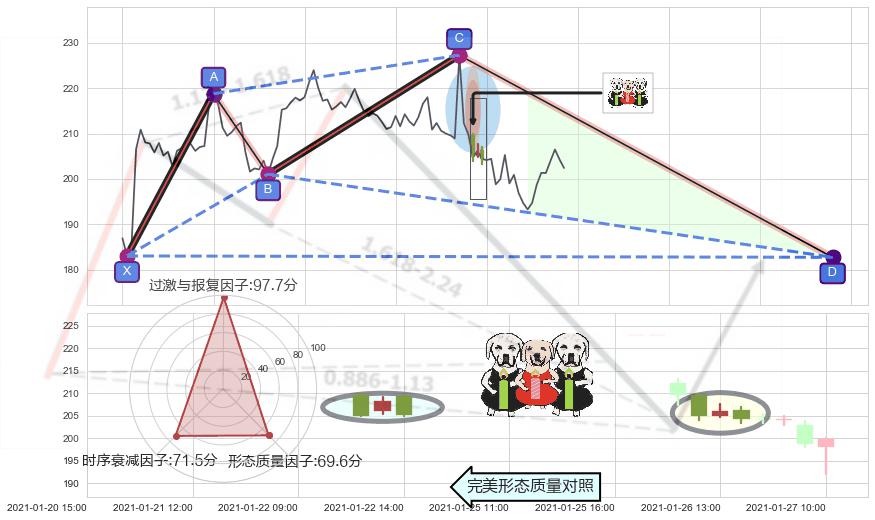 ➣ 下跌身怀六甲 + 谐波鲨鱼上拉击穿c下跌拐点信号叠加后【信号初始稳固度】高,【看空】信号叠加【可信度影响大】