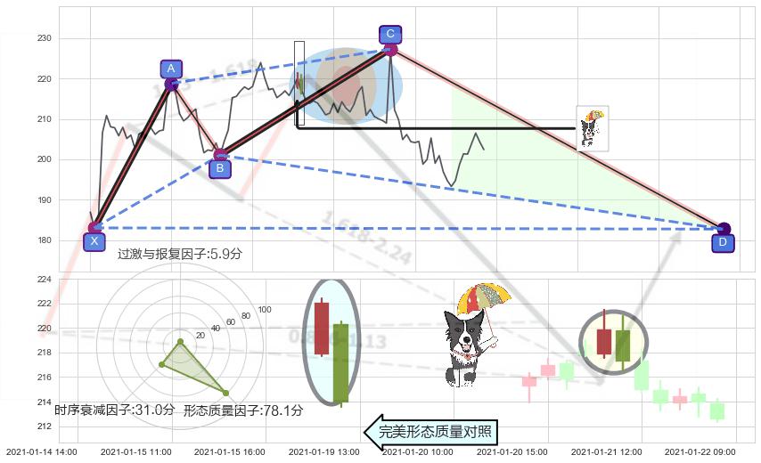 从2021-01-25 11:00至2021-01-27 16:00,共包含22个小时,阶段股价下跌-7.92%,阶段股价变动位移路程比: 1 : 4