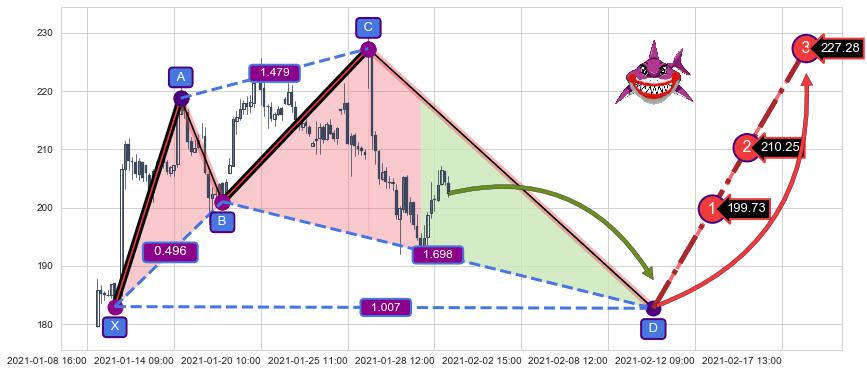 ➢ 距离预测D点位置尚有下跌空间,短线依然【看跌】, 耐心等待看涨【鲨鱼】形态反转启动