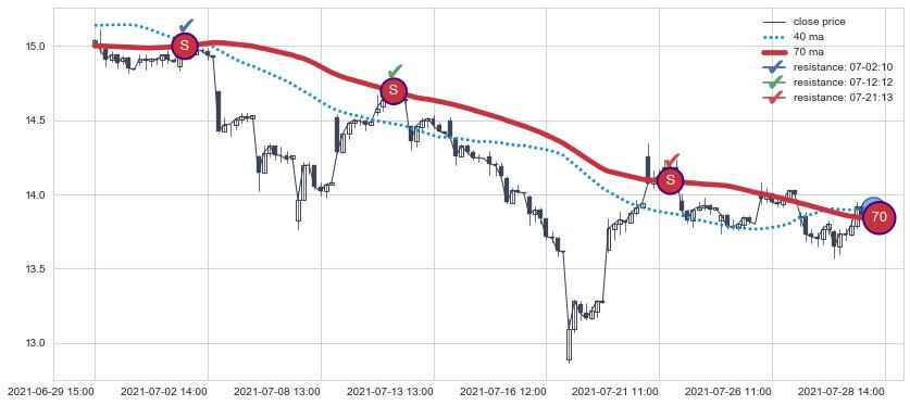 ➢ 最优均线组合共正确确认支撑阻力信号5处,正确确认率 71.43%