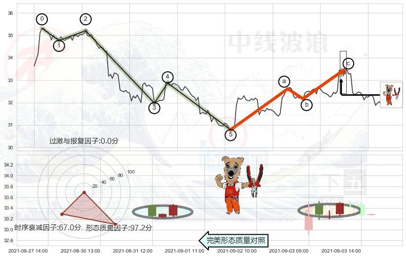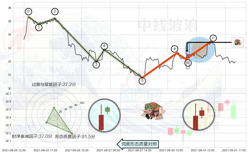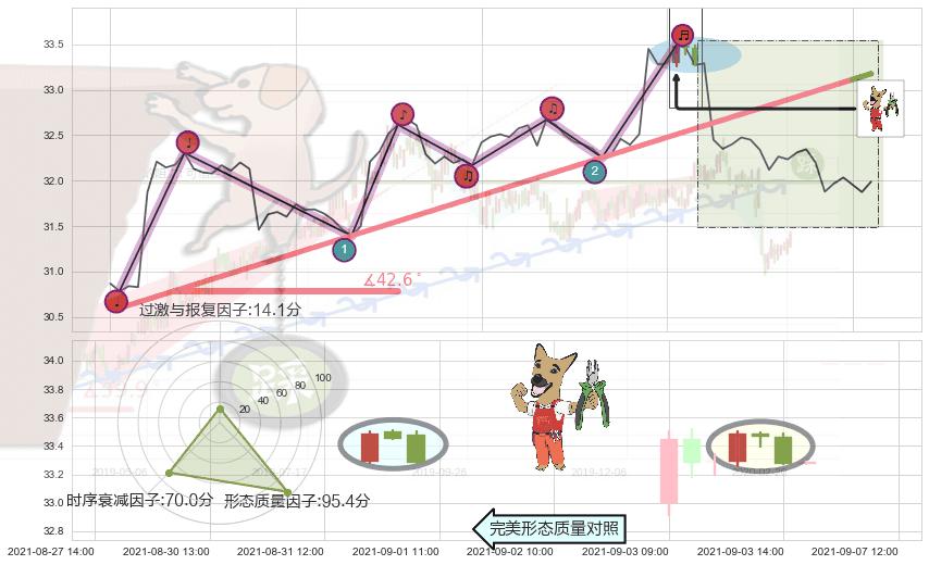 ➢ 2021-08-20 13:00-2021-09-09 12:00上升趋势存在反转[风险],其原上升趋势的支撑位(33.18)已破位[强阻力信号],原上升趋势角度: 42.6˚