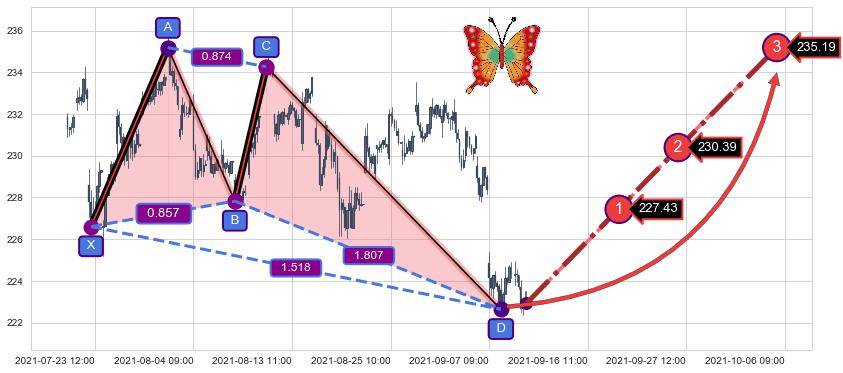 ➢ 谐波蝴蝶:c下跌到达d:猜想拉升 → 上涨 →【拐点】强支撑临近 → 大趋势均值回复