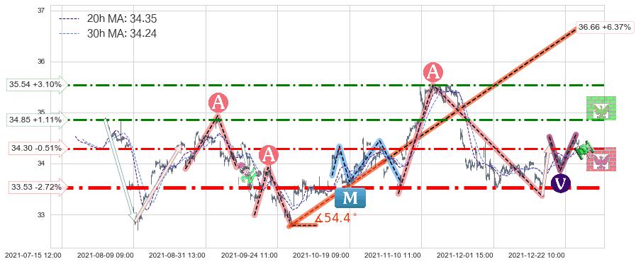 ♘ 阻力价格位34.85,可信任强度69.59%,距离最后交易2021-12-27 15:00形成的收盘价格34.47相差 +1.11%