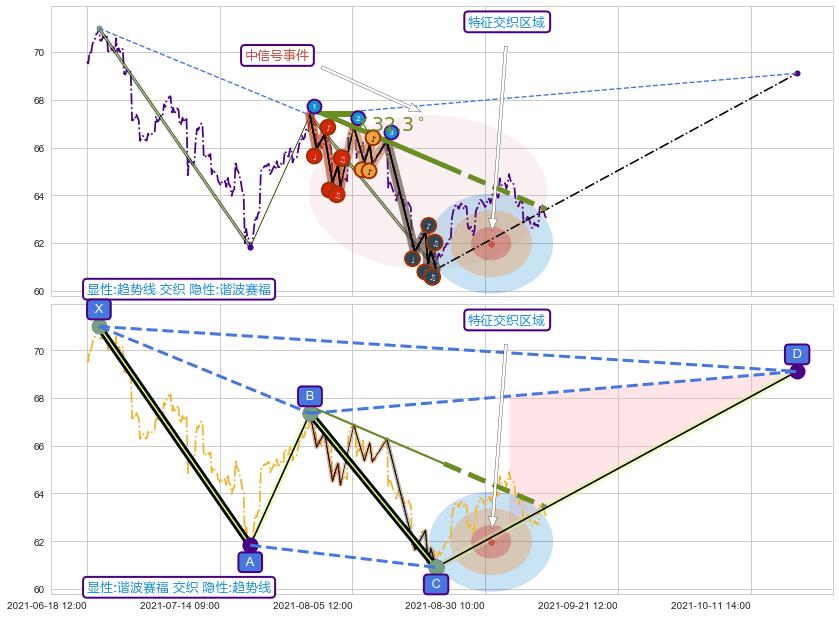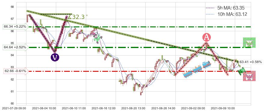 ➣ 2021-07-29 10:00-2021-08-23 09:00下跌趋势存在反转上涨[机会],虽然原下跌趋势的阻力位(63.41)已被突破,但其阻力效果尚存,原下跌趋势角度: 32.3˚
