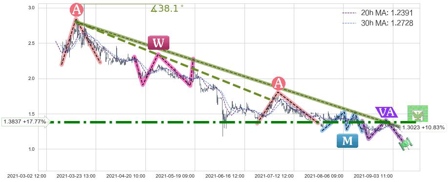 从2021-03-12 15:00至2021-09-09 14:00,共包含660个小时,阶段股价下跌-72.75%,阶段股价变动位移路程比: 1 : 12,下跌趋势角度: 38.1