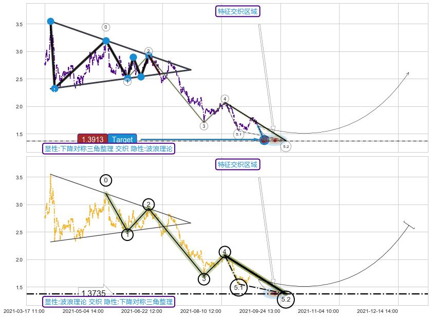 ➢ 波浪理论下跌浪临近浪5反弹点 🔜 下降对称三角整理临近target支撑拐点上涨 综合量化分数:53.85 【偏多】