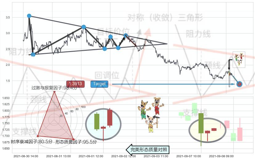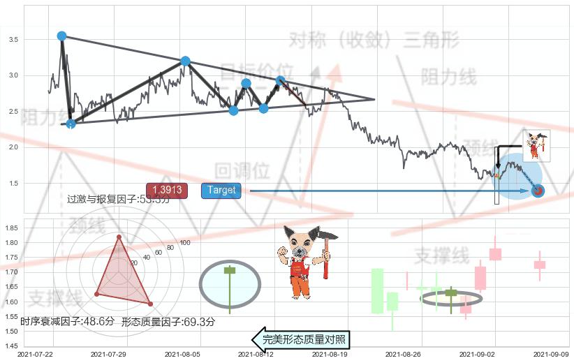 ➢ 锤头线(锤子线) 🔜 下降对称三角整理临近target支撑拐点上涨 综合量化分数:54.64 【偏多】