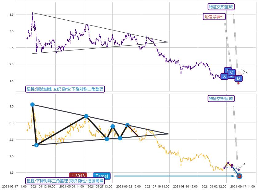 ➢ 谐波蝴蝶属【短级别信号事件】下降对称三角整理属【长级别信号事件】长短周期组合信号事件, 短长事件长度比8.60%