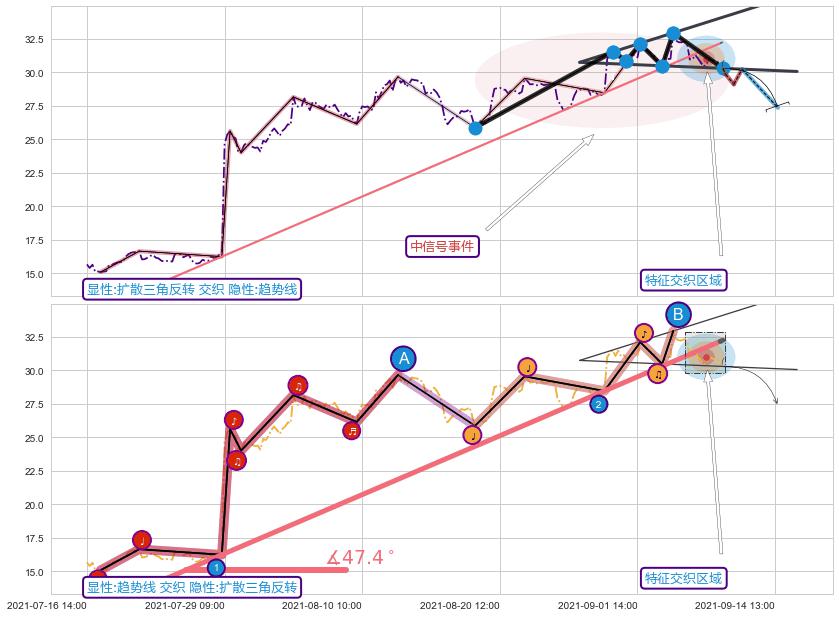 ➢ 2021-07-19 13:00-2021-09-09 14:00上升趋势存在反转[风险],其原上升趋势的支撑位(32.25)已破位[强阻力信号],原上升趋势角度: 47.4˚