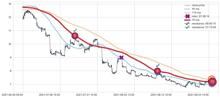 ➣ 70小时均线于(06-28 15:00: 12.77)形成【死叉】基于【死叉历史模型】预测死叉后最低波谷价格: 11.95, 死叉后最低价格6.52,已经下跌超出预测最低波谷价格, 预期反弹