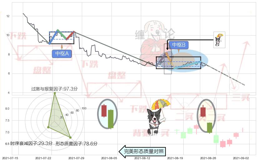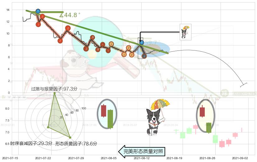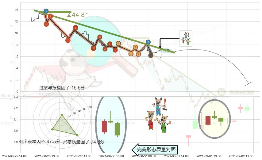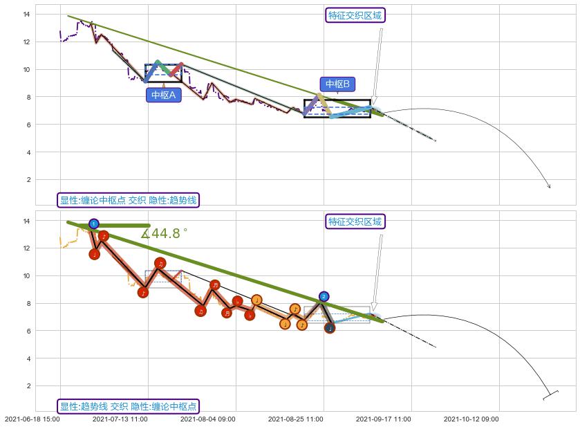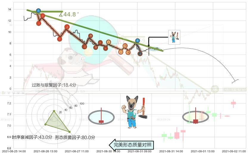 从2021-06-22 11:00至2021-08-27 10:00,共包含304个小时,阶段股价下跌-54.28%,阶段股价变动位移路程比: 1 : 6,下跌趋势角度: 44.8