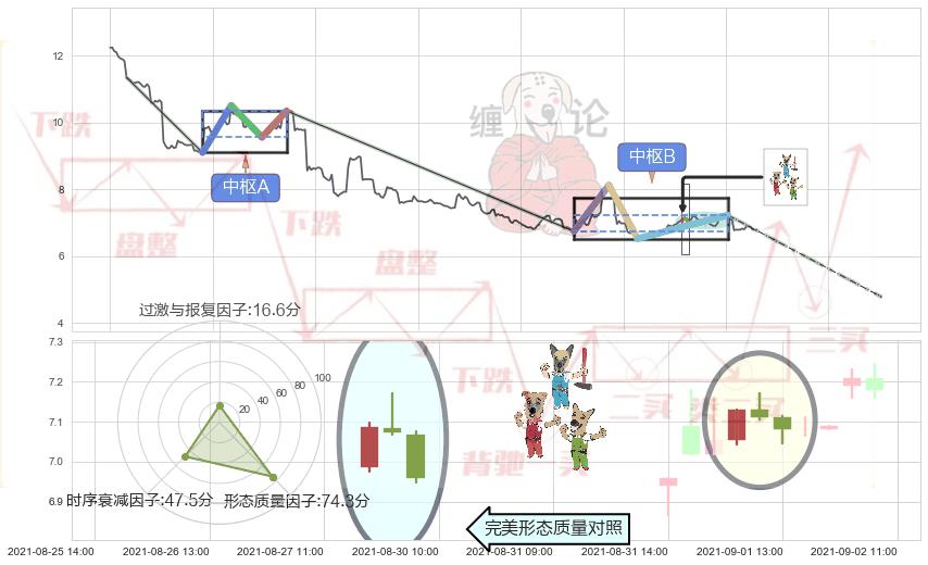 ➣ 下降插入线(坠落线) + 缠论中枢点破位中枢B支撑下拉信号叠加后【信号初始稳固度】极低,【看空】信号叠加【可信度影响极小】