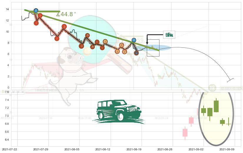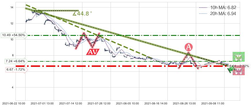 🦴 长线均值回复组合短线趋势跟踪[强阻力信号]2021-06-22 11:00-2021-08-27 10:00下跌趋势依然成立(下跌趋势跟踪依然存在),短线价格略微上行反弹(均值回复猜想),即将接近下跌趋势提供的未破位阻力价格:6.64。