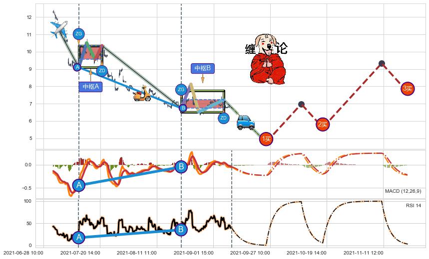 ➣ 缠论中枢点:猜想破位中枢B后持续下拉 → 下跌 → 破位中枢B支撑 → 持续趋势跟踪