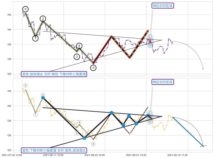 ➢ 波浪理论与下降对称三角整理信号事件周期长度级别相同,同周期信号事件