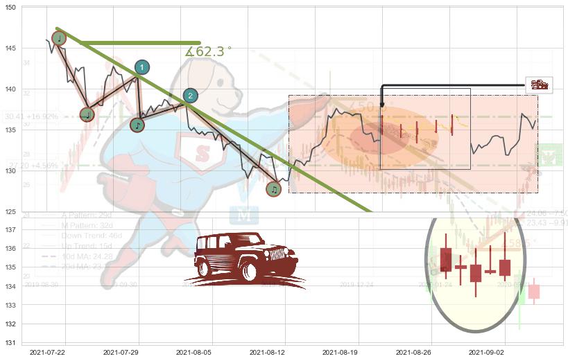 从2021-08-02 12:00至2021-08-09 09:00,共包含32个小时,阶段股价下跌-6.23%,阶段股价变动位移路程比: 1 : 3