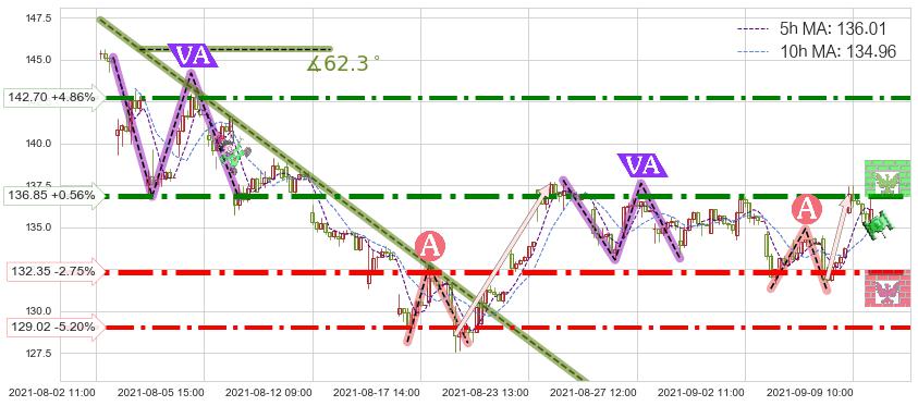 ♘ 阻力价格位136.85,可信任强度89.47%,距离最后交易2021-09-09 14:00形成的收盘价格136.09相差 +0.56%