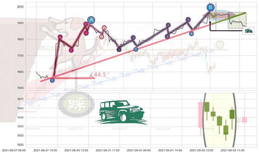 ➣ 2021-08-03 09:00-2021-09-02 13:00上升趋势存在反转[风险],其原上升趋势的支撑位(1961.07)已破位[强阻力信号],原上升趋势角度: 44.5˚