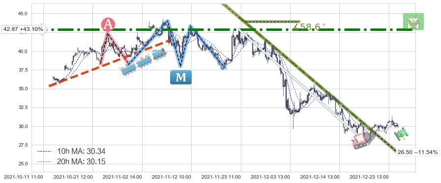 从2021-11-23 09:00至2021-12-21 13:00,共包含138个小时,阶段股价下跌-33.18%,阶段股价变动位移路程比: 1 : 4,下跌趋势角度: 49.7
