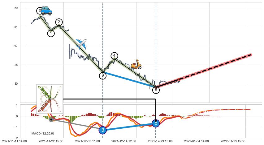 ➣ 单针探底(定海神针) + 波浪理论下跌浪:浪5反弹拐点信号叠加后【反向回撤率】极低,【看多】信号叠加【存续影响极大】