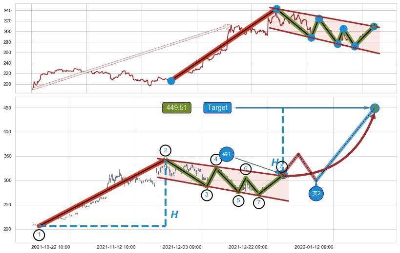 ➣ 降楔型:猜想预期上涨目标target即将达成,随后猜想强阻力来临,预期回调下跌(均值回复)
