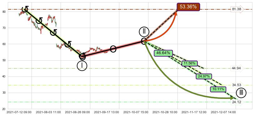 从2021-07-23 13:00至2021-08-26 09:00,共包含141个小时,阶段股价下跌-28.98%,阶段股价变动位移路程比: 1 : 3,下跌趋势角度: 61.6,2021-07-30 09:00向↘︎形成缺口,跳空下跌-18.17%˚