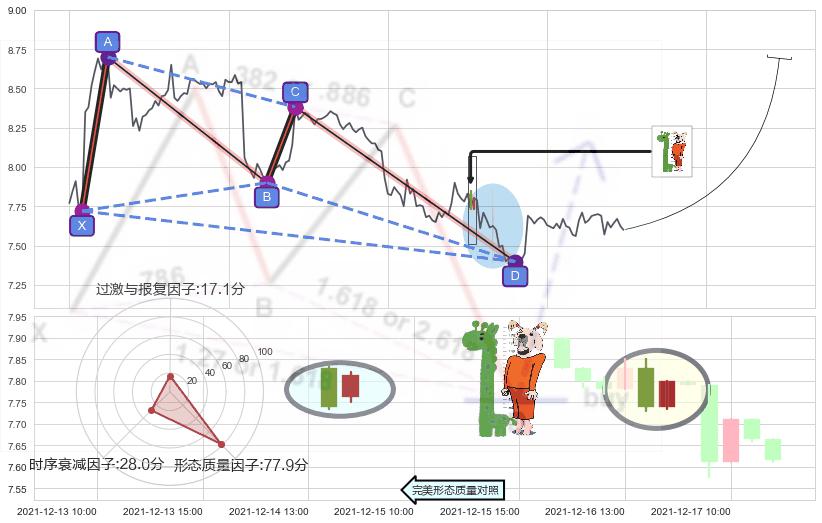 从2021-12-07 10:00至2021-12-21 09:00,共包含74个小时,阶段股价下跌-8.33%,阶段股价变动位移路程比: 1 : 5