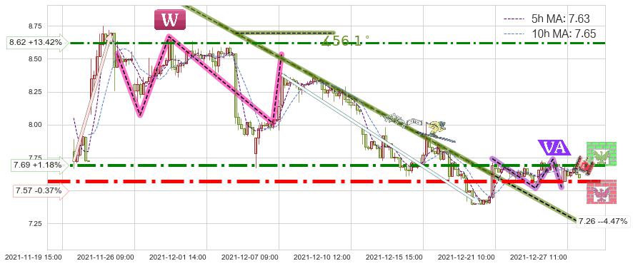 ♘ 阻力价格位7.69,可信任强度84.42%,距离最后交易2021-12-27 15:00形成的收盘价格7.60相差 +1.18%