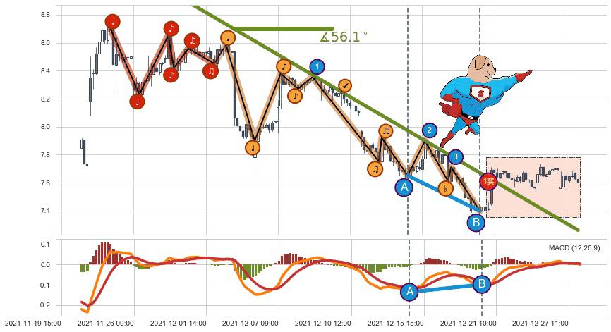 ➢ 2021-11-23 16:00-2021-12-20 15:00下跌趋势存在反转上涨[机会],其原下跌趋势的阻力位(7.26)已被突破[强支撑信号],原下跌趋势角度: 56.1˚