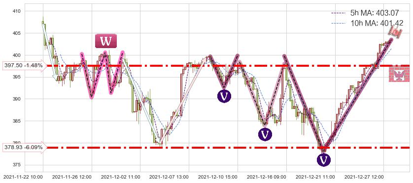 ♘ 支撑价格位397.50,可信任强度83.67%,距离最后交易2021-12-27 16:00形成的收盘价格403.48相差 -1.48%
