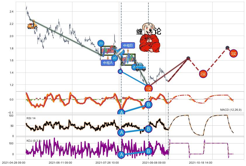 ➣ 缠论买卖点:下降缠中枢AB形成后猜想拐点1买已到达,猜想后续持续拉升(均值回复)