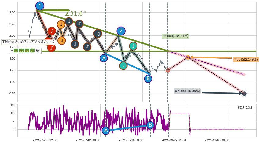 ♘ 在最后的下跌阶段2021-04-28 09:00至2021-08-31 14:00,存在 持续未破位的阻力位 ,阻力价格1.6655,可信任强度82.39%,其距离最后价格1.2500相差 +33.24%